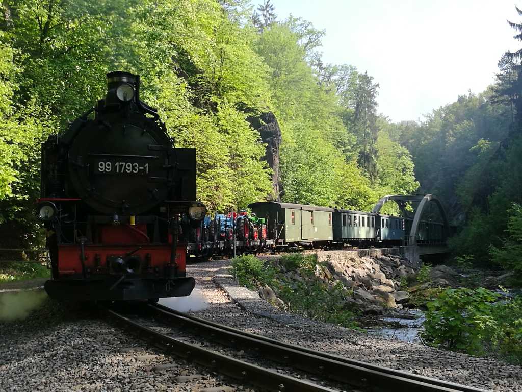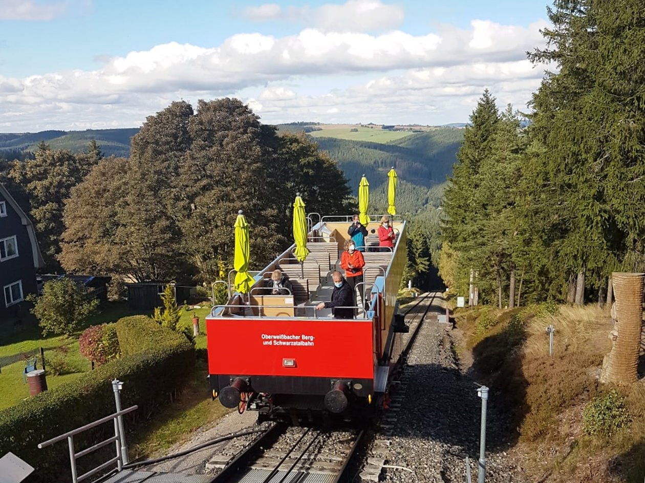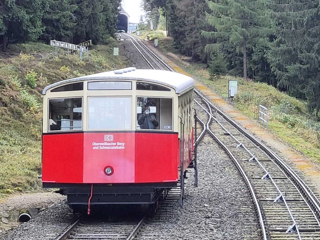 Unsere diesjährige Vereinsfahrt führte uns nach Thüringen. Am ersten Tag besuchten wir die 1923 eröffnete Oberweißbacher Bergbahn, die bis heute lt. Betreiber „als steilste Standseilbahn der Welt zum Transport normalspuriger Eisenbahnwagen“ gilt.